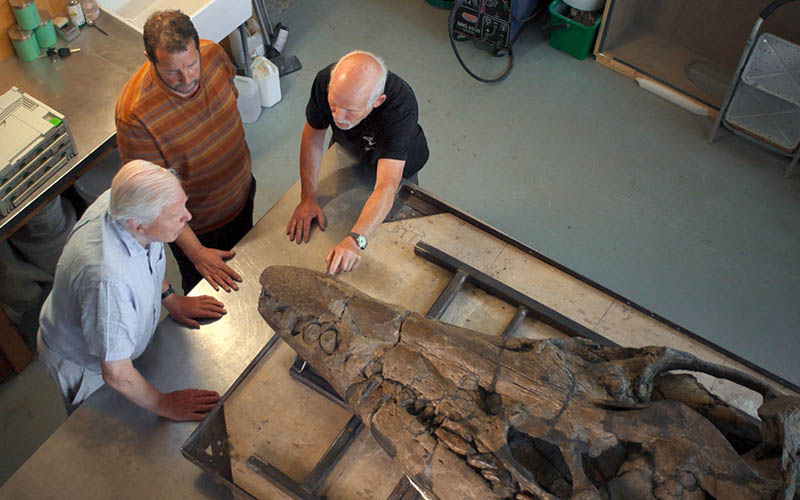 The pliosaur had come to rest on its back and it was slightly tilted. Releasing it was very hard and hot work, excavating over three weeks in five hour rotating shifts. The team had to net the cliffs, cut a cave and cover the precious exposed bones with foil and plaster which was then strengthened with wire mesh.
