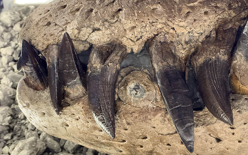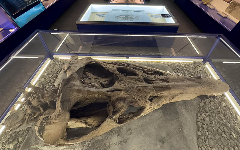 Some of the teeth on the skull had to be recreated as they’d snapped off. A complete tooth was scanned at Southampton University and used to make replicas. This is the only restoration but it shows the full impact of the pliosaur and helps bring it to life.