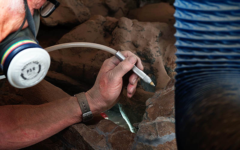 The mudstone had to be cleared off with compressed air pens and then all the bone fragments had to be put back together like a jigsaw. Air abrading was used to finish the skull off and show all its detail.
