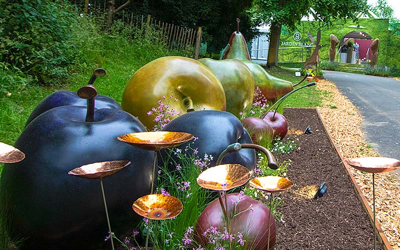 Nestled in a peaceful corner of the show, is Jardin Blanc with menus designed by Raymond Blanc OBE. Dorset sculptor Simon Gudgeon’s outsize bronze fruit sculpture can be seen at the entrance.