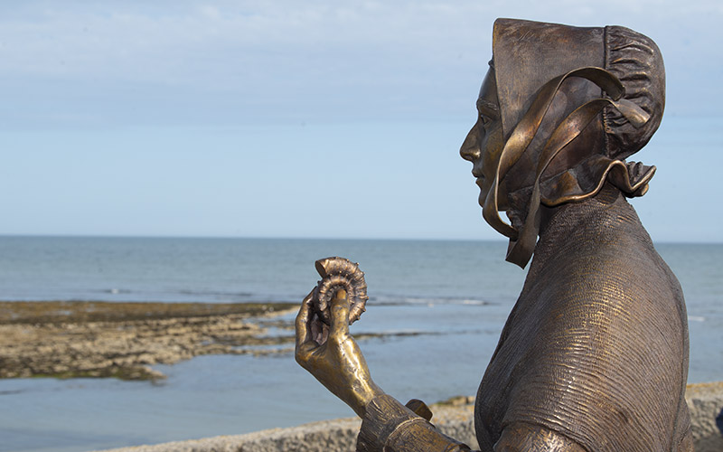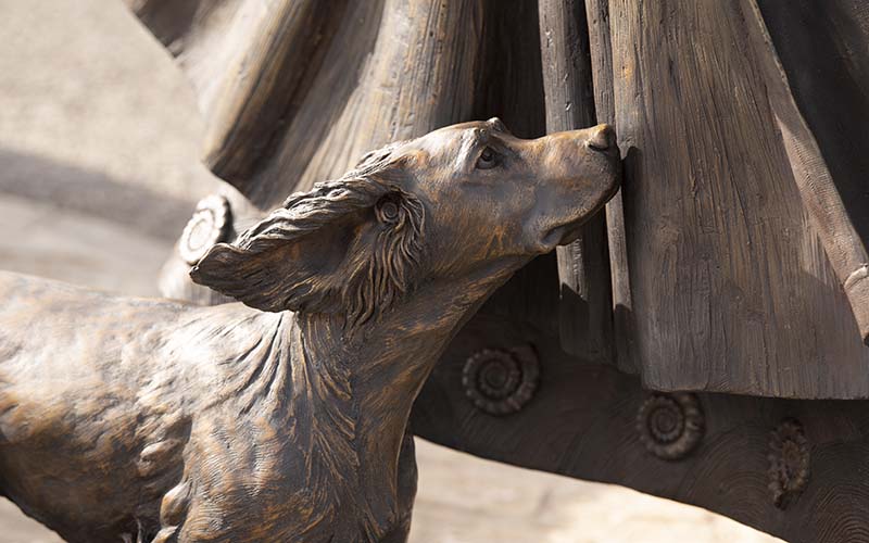 Sculptor Denise Dutton had the honour of creating the one-and-a-quarter life-size bronze statue of Anning and her dog Tray. It contains incredible detail and has 27 ammonites dotted throughout it as well as belemnites and ichthyosaur bones.
