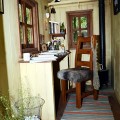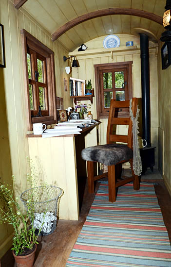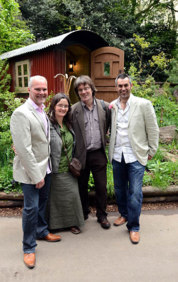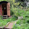 Tracy Chevalier in the The Plankbridge Hutmakers Ltd garden